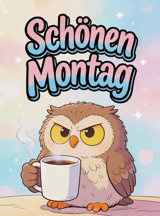 Verschicke eine Schönen-Montag-Karte mit einer mürrischen Eule und einer Kaffeetasse für einen leichteren Start in den Morgen. Entdecke auch schönen montag und schöne woche, viel kraft schönen montag und schönes bild schönen montag.