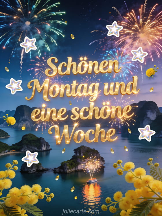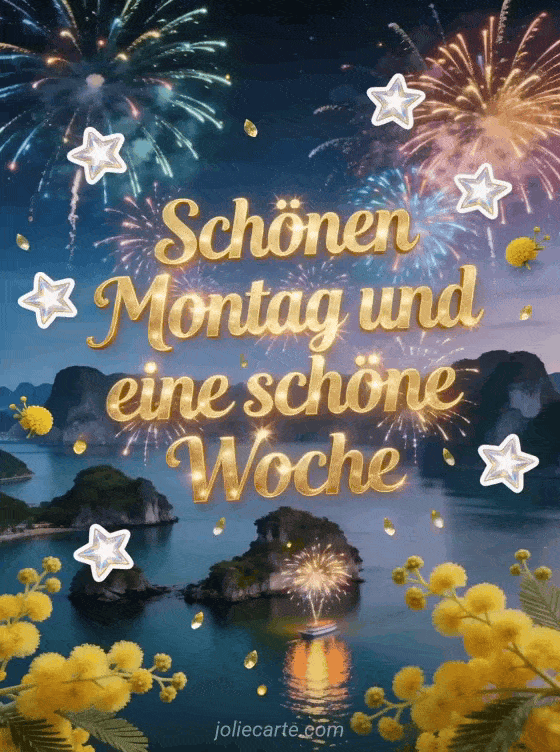 Starte die Woche mit einem festlichen schönen Montag über der Halong-Bucht, mit buntem Feuerwerk, gelben Mimosenblüten und goldenen Reflexen auf ruhigem Wasser. Entdecke auch schönen Montag Küsschen GIFs, schönen Montag gute Woche GIFs oder animierte GIFs schönen Montag.