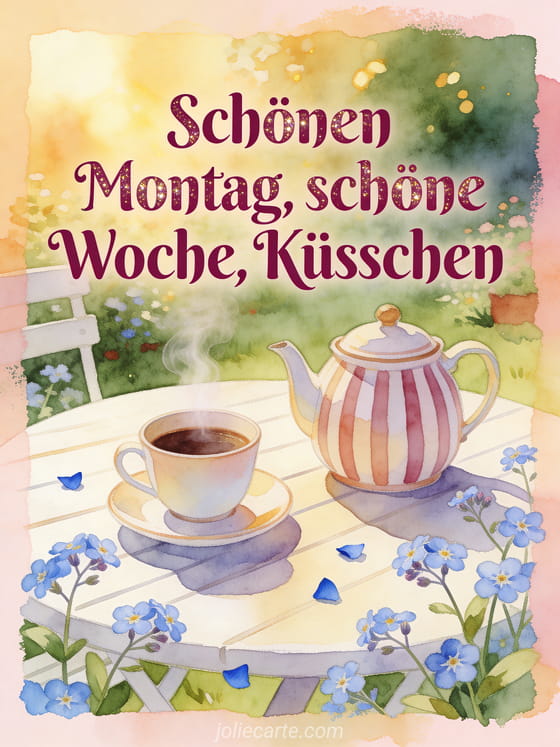 Beginne die Woche mit Vergissmeinnicht, blauen Blütenblättern, einer dampfenden Kaffeetasse und einer gestreiften Teekanne auf einem sonnigen Gartentisch. Dazu passen schöne Weihnachtswoche Küsse, Küsschen und schöne Woche oder Küsschen zum Montag schöne Woche.