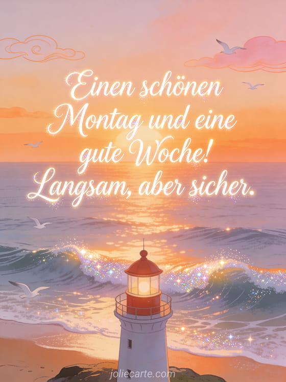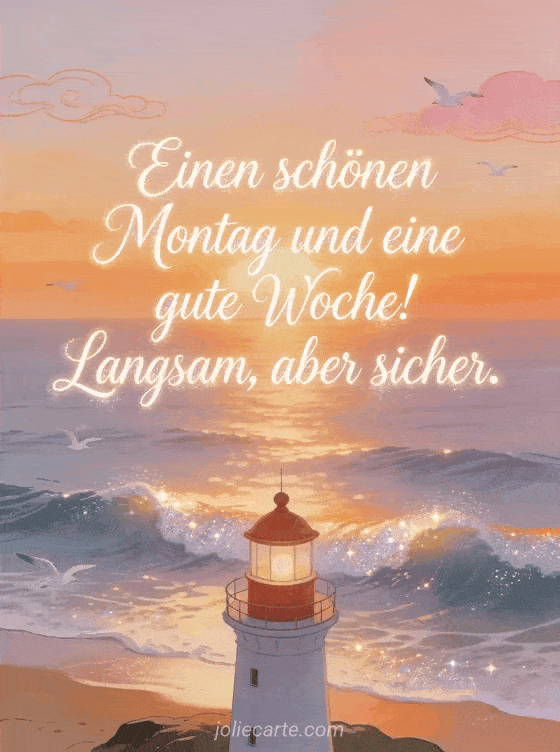 Sende schönen Montag und gute Woche mit einem ruhigen Zitat, dargestellt durch einen Leuchtturm am klaren Sonnenaufgangsmeer und glitzernde Wellen. Entdecke auch Schönen Montag Landschaft GIF, kostenloses Schönen-Montag-Bild oder Tiere schönen Montag GIF.