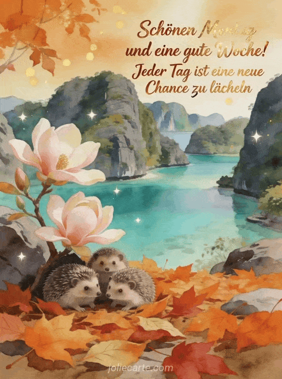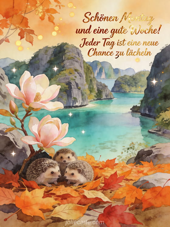 Teile eine inspirierende Montagsbotschaft mit türkisfarbener Lagune, Herbstblättern, einer Igelfamilie und blühender Magnolie. Entdecke auch virtuelle schönen montag karte, e-card schönen montag und schönen montag karte.