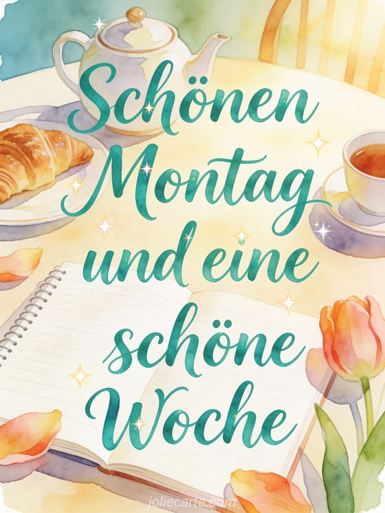 Sende einen fröhlichen Montagsgruß mit einer gemütlichen Frühstücksszene und einem warmen Wunsch für die neue Woche. Entdecke auch Montag schönen Tag Bilder, Guten Morgen am Montag Bild oder Schönen Montag Blumen Bild.