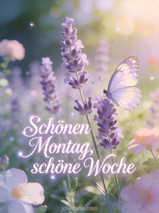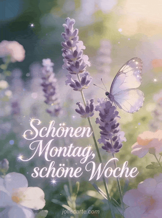 Verschicke eine schöne Montagskarte mit einem Schmetterling auf Lavendelblüten für einen ruhigen Wochenstart. Entdecke auch viel kraft schönen montag, schönes bild schönen montag und schönen regnerischen Montag.