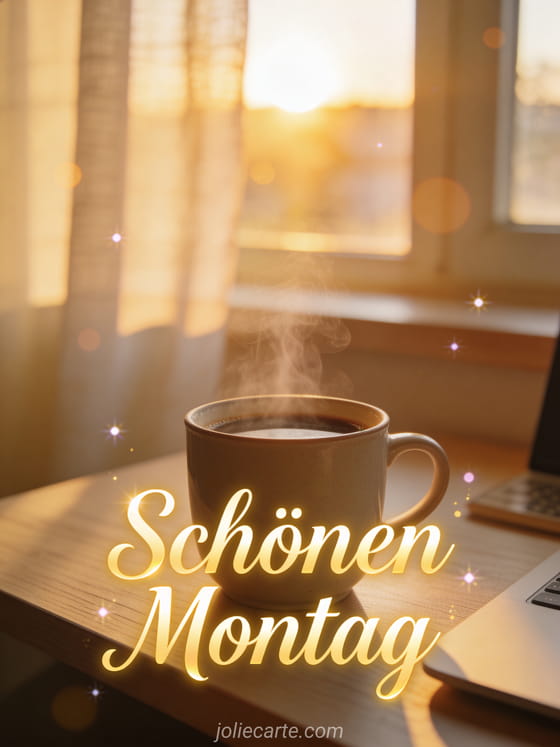 Starten Sie die Woche mit positiver Energie und versenden Sie diese wunderschöne Karte für einen schönen Montag. Eine dampfende Kaffeetasse auf einem gemütlichen Schreibtisch, in warmes Morgenlicht getaucht. Entdecken Sie auch eine Karte für schönen Montag und schöne Woche oder eine Karte mit positivem Montag-Zitat.