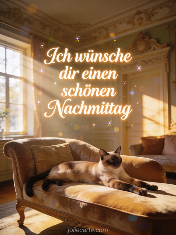 Sende diesen eleganten Schönen-Nachmittag-Wunsch mit einer süßen Siamkatze die sich luxuriös auf einer Samtliege im warmen Nachmittagslicht streckt. Entdecke auch eine Karte Guten Nachmittag Bild oder eine Karte schönen Nachmittag Regen.