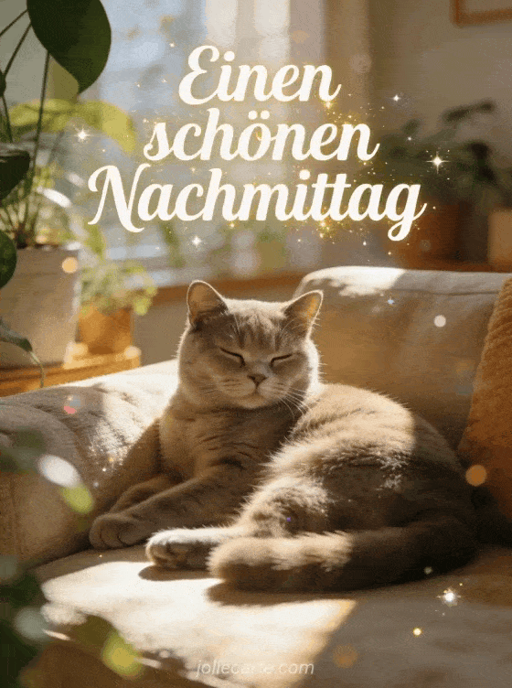 Teile einen Schönen-Nachmittag-Gruß mit dieser gemütlichen British Shorthair Katze-Karte. Entdecke auch Guten Nachmittag GIFs oder ein Guten Nachmittag Bild.