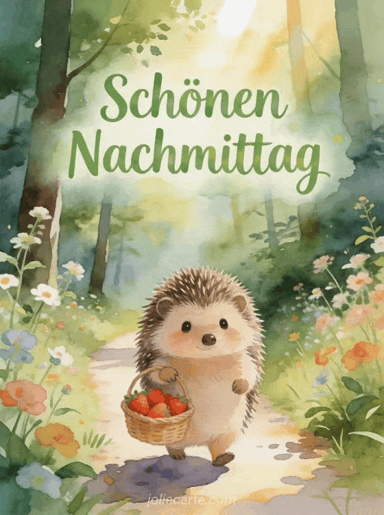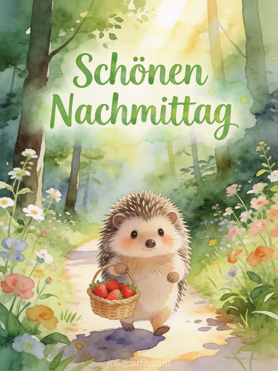 Verschönern Sie jemandem den Nachmittag mit dieser entzückenden Karte, die einen süßen Igel mit einem kleinen Erdbeerkörchen auf einem sonnigen Waldweg mit Wildblumen zeigt, gemalt im weichen Aquarellstil. Entdecken Sie auch eine guten nachmittag oder eine guten nachmittag humor.