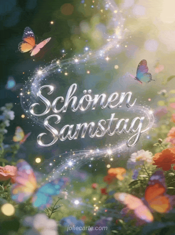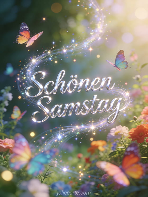 Teile ein animiertes Bild zum schönen Samstag mit schimmernder silberner Schrift, bunten Schmetterlingen und einem traumhaften verzauberten Garten. Entdecke auch schönen tag samstag oder schönen samstag meine liebe.