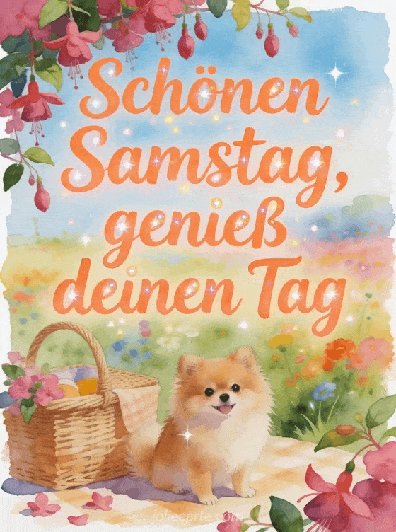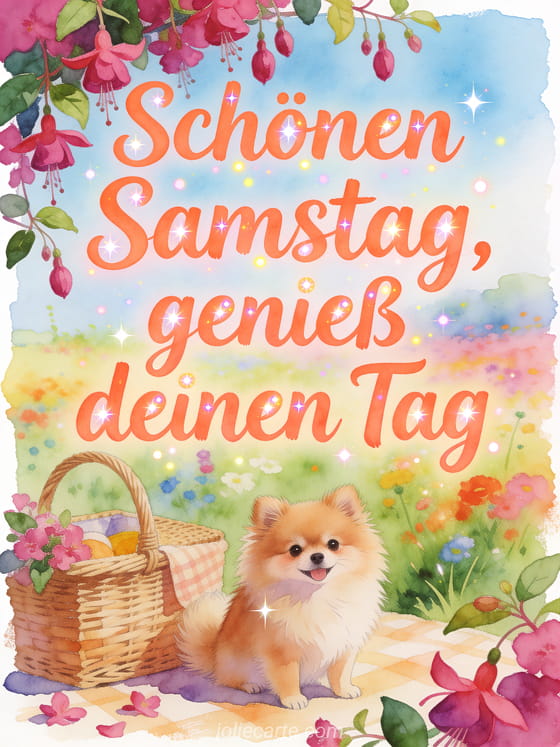 Teile ein Schönen Samstag animiertes GIF mit korallfarbener Schrift, einem kleinen Zwergspitz, einem Picknickkorb aus Weide und hängenden Fuchsien über einer lebendigen Wiese. Du kannst auch sehr schönen Samstag GIF, kostenlose Bilder schönen Samstag und schönes Wochenende oder Schönen Samstag und Wochenende Bild senden.