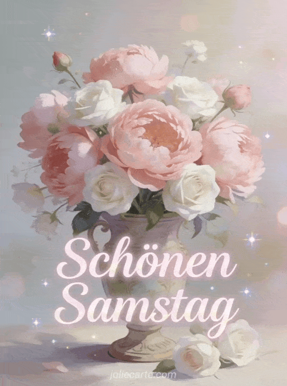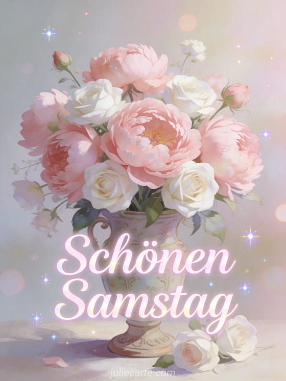 Teile einen feinen Gruß zum schönen Samstag mit einem Strauß rosa Pfingstrosen und weißen Rosen in einer Vintage-Vase, in weichem Morgenlicht. Entdecke auch ein Schönen Herbstsamstag Bild, Schönen sonnigen Samstag Bilder oder ein schönen Samstag meine Freundinnen Bild.