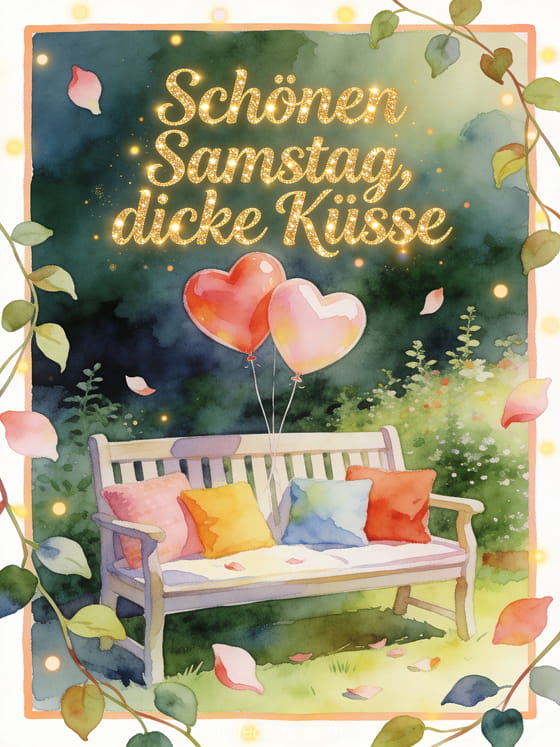 Teile schönen Samstag und dicke Küsse mit einer Aquarellkarte, die eine Gartenbank mit bunten Kissen, herzförmigen Ballons, Blütenblättern und Ranken zeigt. Entdecke auch eine Karte mit Guten Morgen Samstag kostenloses Bild, schöne Schönen-Samstag-Bilder oder Schönen Samstag und schönes Wochenende animiertes GIF.