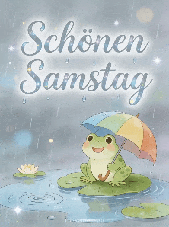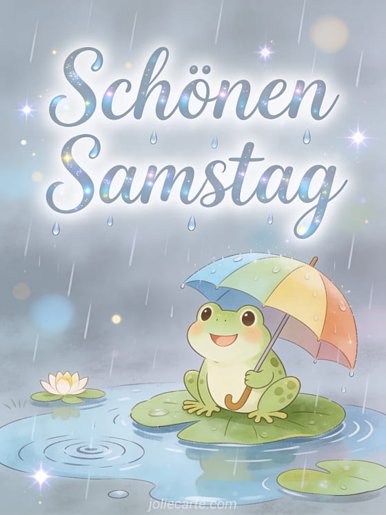 Verschönere einen regnerischen Samstag mit dieser fröhlichen Karte mit einem süßen Frosch unter einem bunten Regenschirm. Entdecke auch eine danke schönen samstag Karte oder eine bild schöner samstag katze Karte.