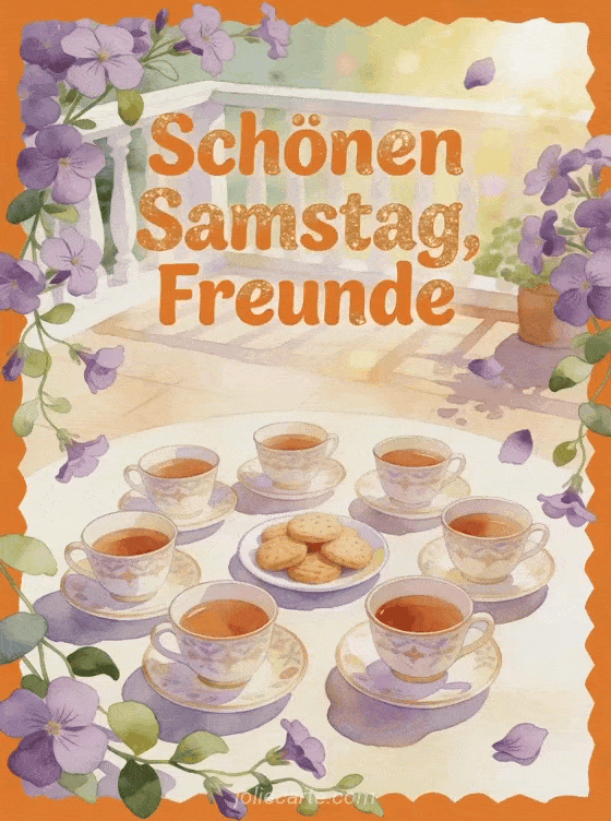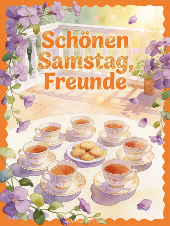 Teilt einen geselligen Samstagmoment mit einer Aquarellkarte mit gemusterten Teetassen, einem kleinen Teller Kekse und violetten Blaukissen auf einer sonnigen Terrasse. Du kannst auch ein Guten Morgen schönen Samstag Bild senden, ein Schönen Samstag animiertes GIF wählen oder ein sehr schönen Samstag GIF teilen.
