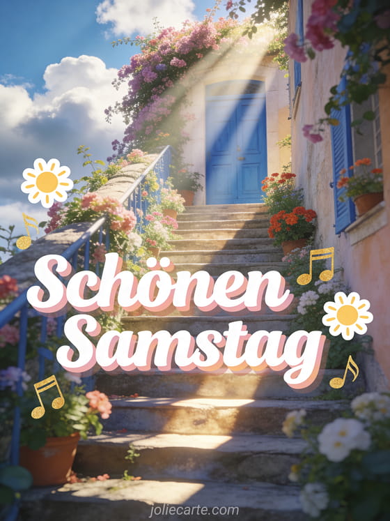 Sende Schönen Samstag Freunde GIFs mit fröhlichen weißen Buchstaben, kleinen Sonnen, goldenen Musiknoten und einer blühenden Treppe zu einer blauen Mittelmeertür. Teile einen fröhlichen Wochenendwunsch und entdecke auch Freundschaft schönen Samstag schönes Wochenende, guten Morgen schönen Samstag Küsse oder Landschaft schönen Samstag Landschaft.