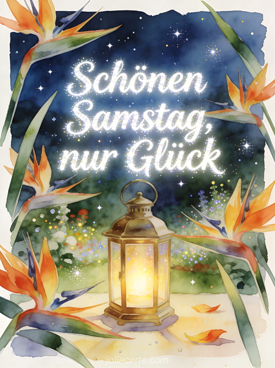 Teile einen fröhlichen Samstagsgruß mit einer Messinglaterne, die zwischen kräftigen Paradiesvogelblumen unter kleinen sternartigen Lichtern leuchtet. Entdecke auch glitzernde GIFs für schönen Samstag, Bild zum Wünschen eines schönen Samstags oder sonniger schöner Samstag GIF.