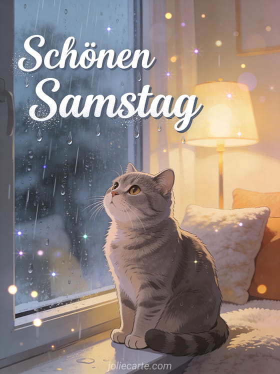Teile einen gemütlichen Samstaggruß mit dieser bezaubernden Karte mit einer British Shorthair Katze, die den Regen beobachtet. Entdecke auch eine guten morgen samstag zitat Karte oder eine hübsche karte schönen samstag.
