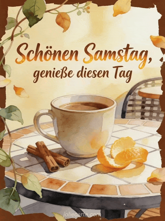Teile eine gemütliche Samstagskarte mit einer Keramiktasse Kaffee, Zimtstangen, heller Zitrusschale und goldenem Morgenlicht auf einem Cafétisch. Du kannst auch Schönen Samstag euch allen Bild senden, Guten Morgen es ist Samstag Bild wählen oder Schönen Samstag GIFs teilen.