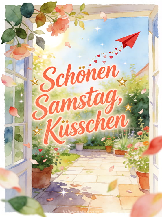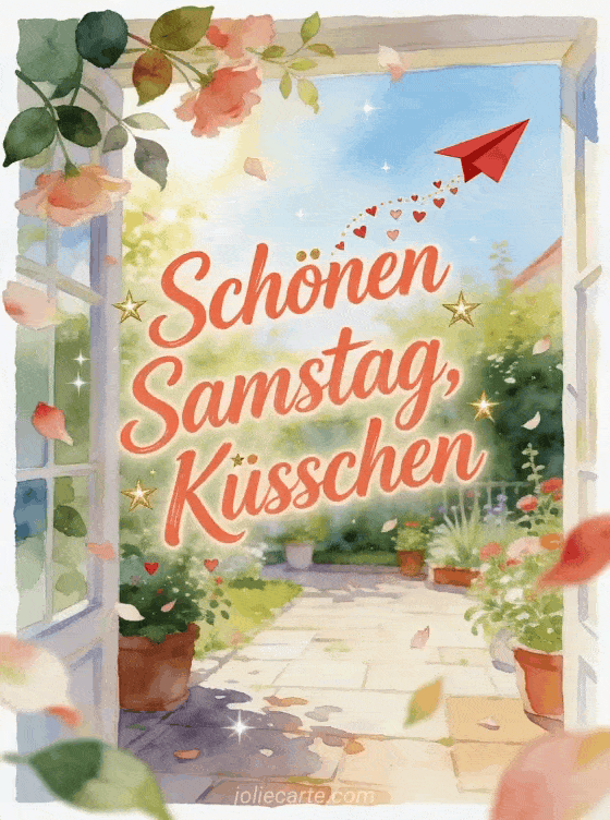 Teile schönen Samstag und Küsschen mit einem roten Papierflieger, der Herzkonfetti durch einen sonnigen Aquarell-Gartenhof trägt. Sende diesen liebevollen Gruß und entdecke auch Schönen Samstag mein Freund Bild, schönen Samstag schönes Wochenende GIF oder Schönen Samstag animierte Bilder.