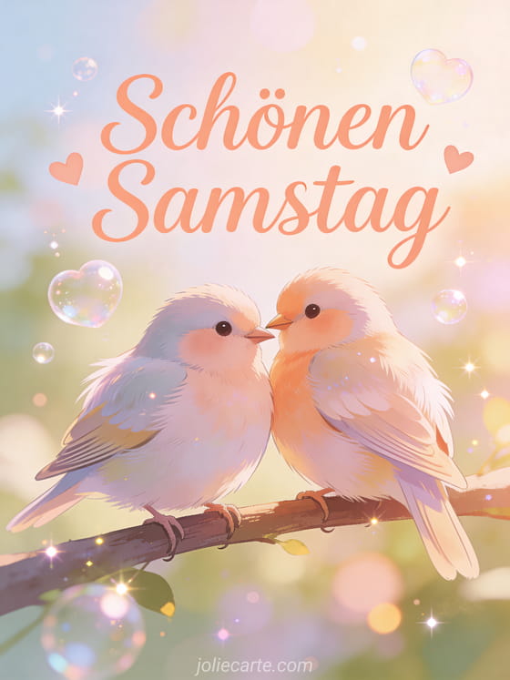 Teile ein Schönen Samstag Küsse Bild mit zwei Unzertrennlichen auf einer gemeinsamen Sitzstange, umgeben von pfirsichfarbener Schrift und Herzblasen in einer süßen Morgenszene. Sende mehr Samstagszuneigung mit Schönen Samstag Bild kostenlos, kostenlose virtuelle Karte schönen Samstag oder Guten Morgen Samstag Bild.