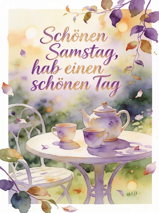 Sende einen freundlichen Samstagsgruß mit einer Keramik-Teekanne, zwei bemalten Tassen und einem runden Gartentisch in warmem Licht. Entdecke auch schönen Samstag romantisches Bild, schönen Samstag schönes Wochenende Bilder oder samstag guten morgen gif.