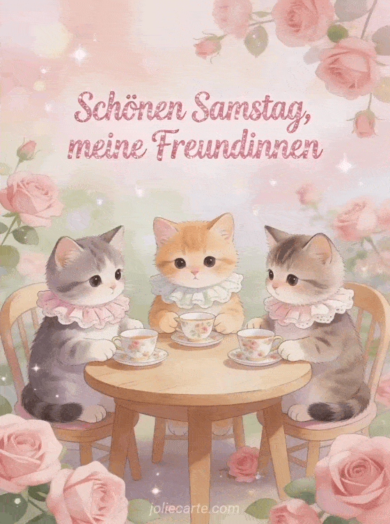 Teile einen süßen Samstagsgruß mit drei niedlichen Kätzchen bei einer Teeparty, kleinen Tassen, rosa Rosen und sanften Pastellfarben. Du kannst auch ein animiertes Bild schönen Samstag oder Schönen Samstag an alle GIF senden.