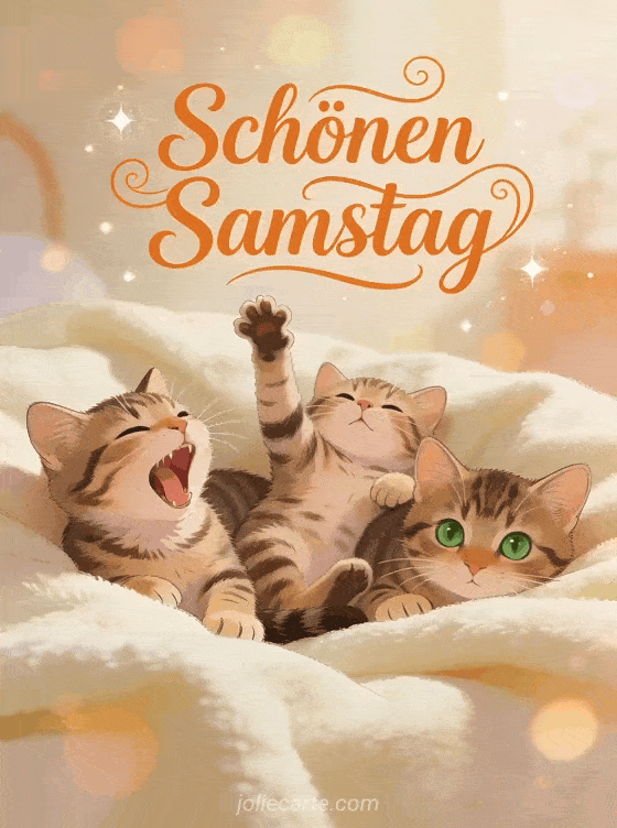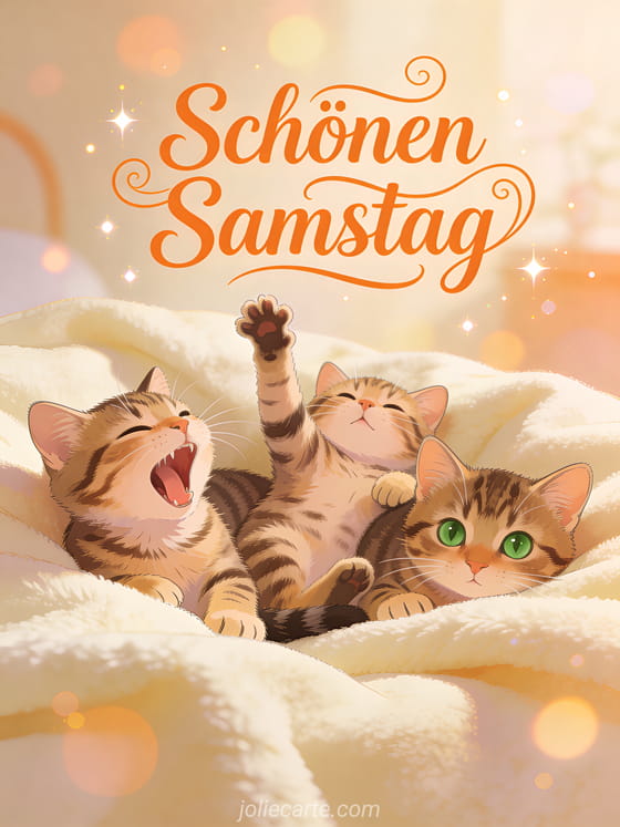 Teile schönen Samstag mit Katzen in einer warmen Morgenszene: drei süße Tigerkatzen kuscheln auf einer weichen cremefarbenen Decke, eine gähnt, eine streckt sich und eine schaut in die Kamera. Entdecke auch Schöne Schönen-Samstag-Karten oder Landschaft hallo Samstag.