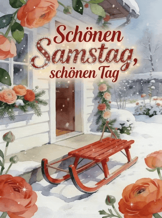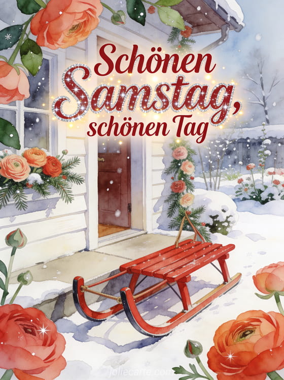 Sende schönen samstag schnee gif mit tiefroter Kalligrafie, einem roten Schlitten neben einer verschneiten Häusertreppe, Ranunkelblüten und immergrünen Zweigen über dem Rand. Dazu passen auch dieses Samstag schönen Tag Gif, diese Schönen Samstag Küsse Bilder oder diese winterliche Schönen-Samstag-Bilder.