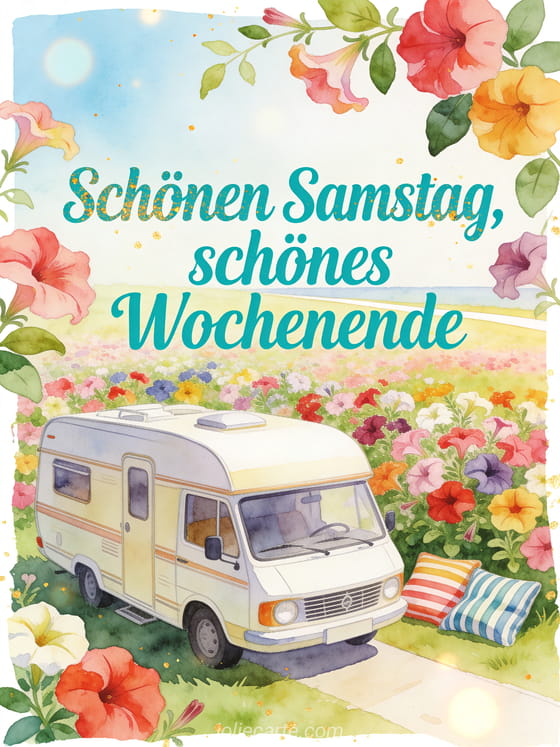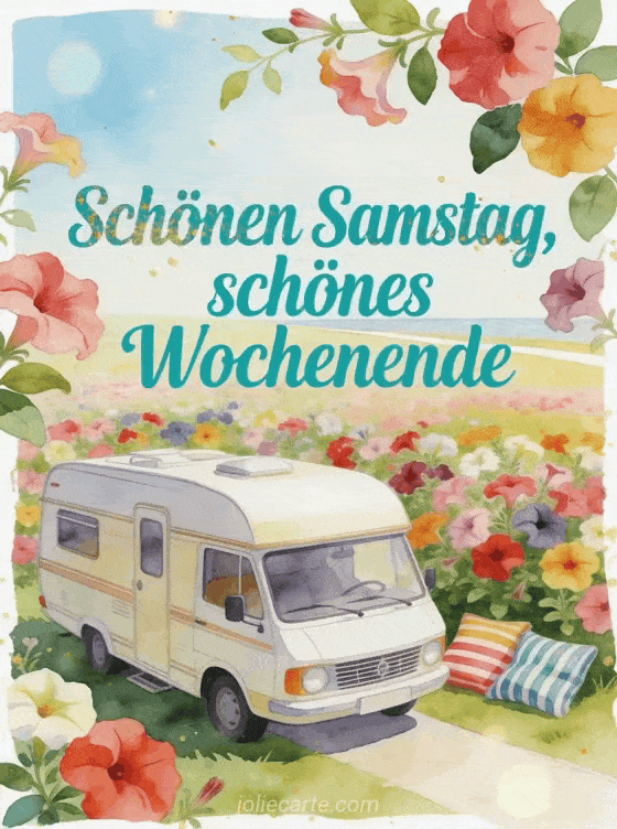 Sende einen fröhlichen Samstagsgruß mit einem kleinen Wohnmobil, bunten Petunien und heller Reiselust. Entdecke auch Schönen Samstag animierte Bilder, schönes Bild für schönen Samstag und schönes Wochenende oder schönen Samstag Schnee Bild.