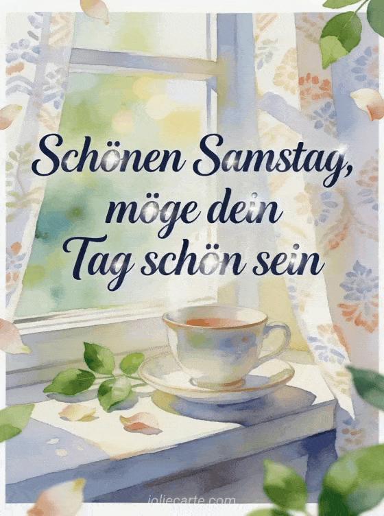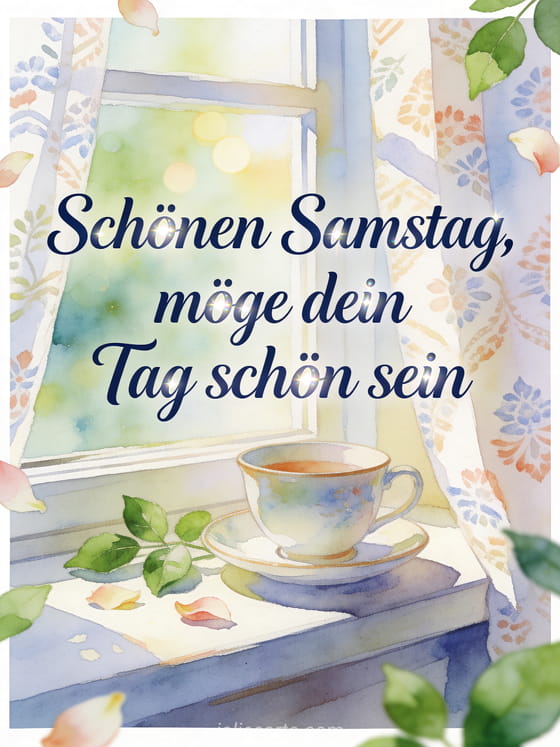 Teile einen Schönen Samstag Text mit eleganter dunkelblauer Kalligrafie, einer Porzellantasse auf der Fensterbank, frischen grünen Blättern, losen Blütenblättern und Morgenlicht durch gemusterte Vorhänge. Du kannst auch Schönen Samstag Freunde Bild, Guten Morgen schönen Samstag Bild oder Schönen Samstag animiertes GIF senden.