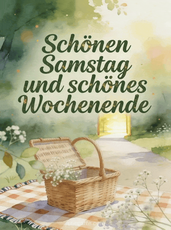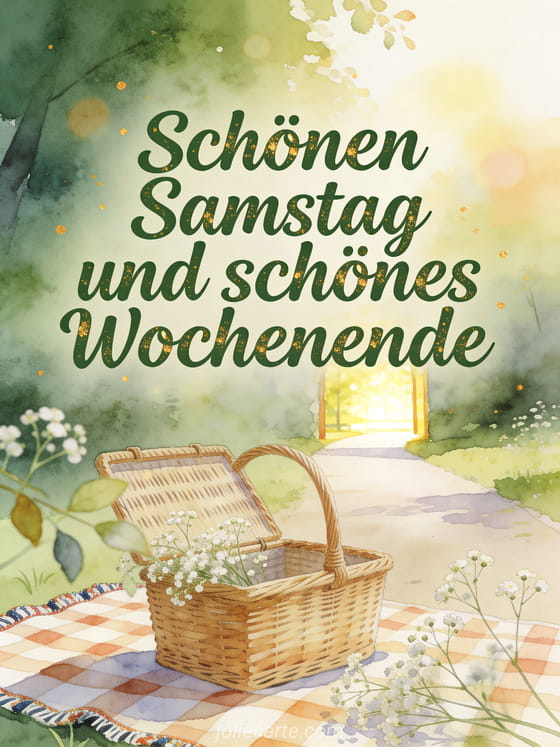 Wünsche schönen Samstag und schönes Wochenende mit einem Aquarell-Picknickkorb, einer karierten Decke, luftigem Schleierkraut und einem sonnigen Parkweg. Entdecke auch eine Karte mit Schönen Samstag Zen Bild, Schönen Samstag Text oder Schönen Samstag Freunde Bild.