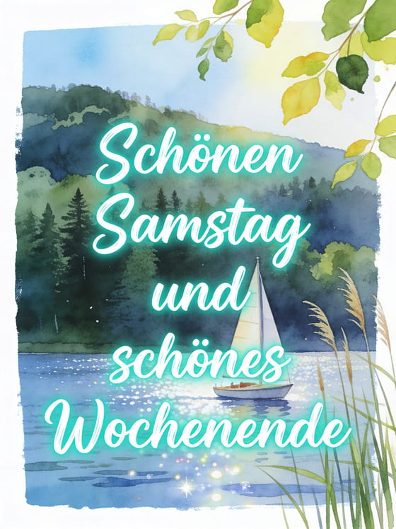 Wünsche schönen Samstag und schönes Wochenende mit einer Aquarell-Seeszene, einem kleinen Segelboot, bewaldeten Hügeln, Schilf und hellen Blättern in sonniger Ruhe. Entdecke auch eine Karte mit schönen Samstag Blumen Bilder, Schönen Samstag Glitzerbilder oder glitzernde GIFs für schönen Samstag.