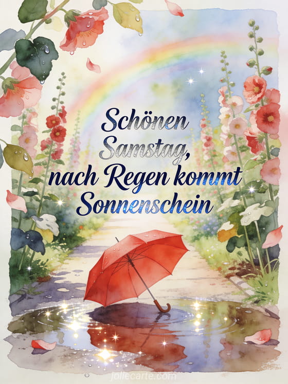 Teile eine hoffnungsvolle Samstagsbotschaft mit einer Aquarellkarte mit Gartenweg, rotem Regenschirm, glänzenden Pfützen, Stockrosen und sanftem Regenbogenlicht. Du kannst auch ein sehr schönes Bild für einen schönen Samstag senden, Schönen Samstag Küsse GIFs teilen oder ein Guten Morgen Samstag Bild wählen.