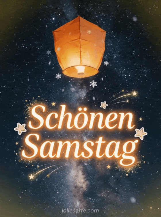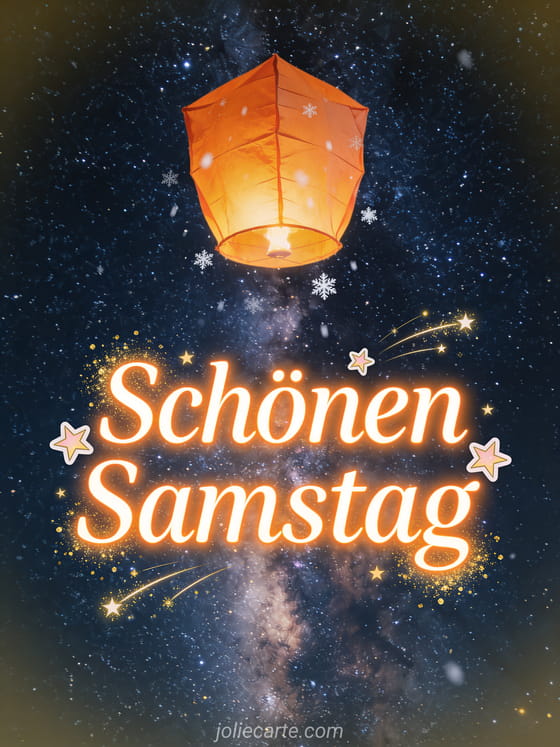 Senden Sie eine magische Karte zum schönen Samstagabend mit orange leuchtenden Buchstaben, Sternschnuppen, goldenem Staub und einer orangefarbenen Papierlaterne, die durch eine verschneite Sternennacht unter der Milchstraße schwebt. Entdecken Sie auch schönen sonnigen Samstag, Bilder schönen Samstag schönes Wochenende oder fröhlichen Samstag und schönes Wochenende.