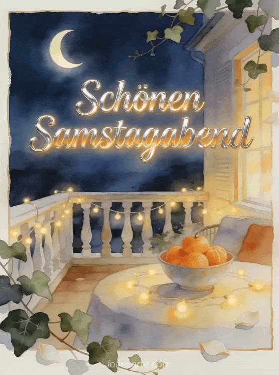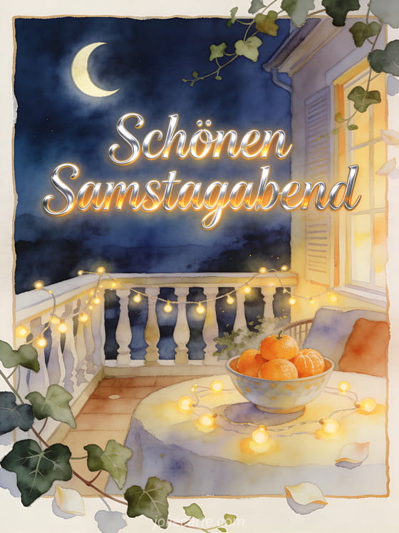 Wünsche einen schönen Samstagabend mit einem Halbmond über einer gemütlichen Terrasse, leuchtender Lichterkette, einer Schale Mandarinen und weichem Efeu in Aquarell-Nachtfarben. Teile diese friedliche Karte und entdecke auch schönen samstag schnee gif, Samstag schönen Tag Gif oder Schönen Samstag Küsse Bilder.