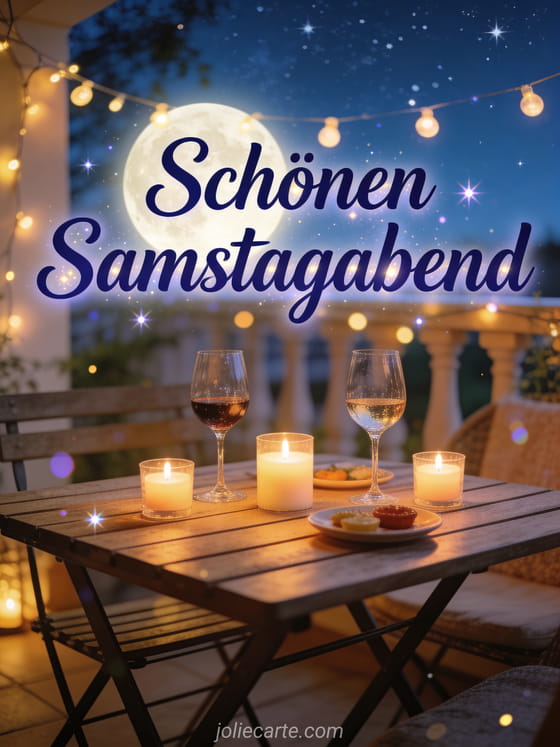 Teile einen warmen Gruß zum schönen Samstagabend mit einer gemütlichen Außenterrasse, leuchtender Lichterkette, Kerzen, Weingläsern und Sternenhimmel. Entdecke auch ein animiertes GIF Guten Morgen es ist Samstag, Schönen Samstag Freunde GIFs oder Freundschaft schönen Samstag schönes Wochenende.