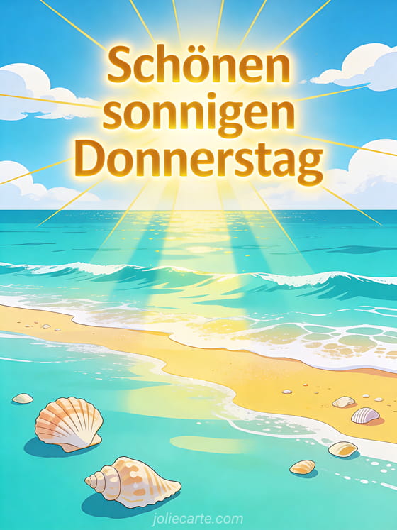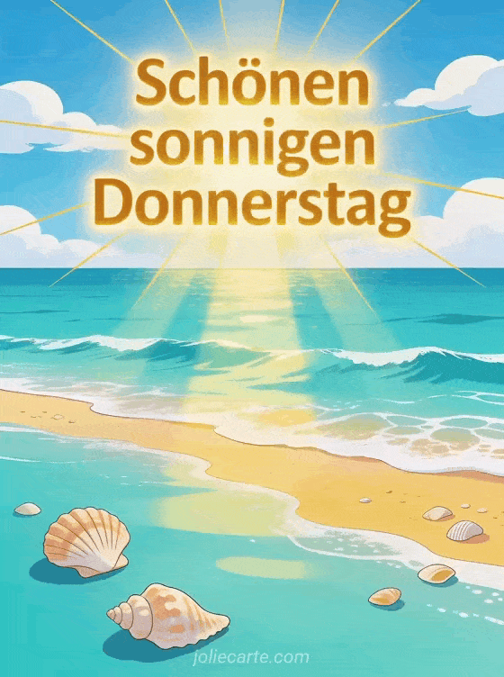 Teile einen schönen sonnigen Donnerstag mit strahlender Sommerschrift, warmem Leuchten, einer lebhaften Sonnenküste, starken Lichtstrahlen, hellen Türkistönen und fröhlicher Stimmung. Entdecke auch Schönen Donnerstag Küsse schöne Bilder, Schönen Donnerstag Hund Bild oder Schönen Donnerstag Katze gif.
