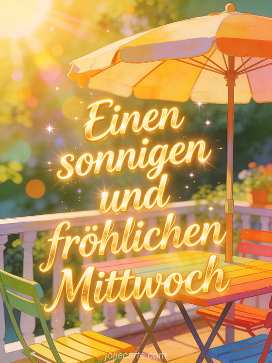 Wünsche einen sonnigen und fröhlichen Mittwoch mit goldener Schrift, strahlendem Leuchten, einem offenen Sonnenschirm auf einer farbenfrohen Terrasse, Lens Flare, funkelndem Bokeh und positiver Stimmung. Entdecke auch Karte schönen Mittwoch Küsse, Text um einen schönen Mittwoch zu wünschen oder Schönen Mittwoch mit Tieren.