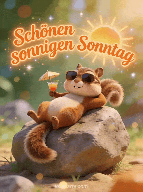 Teile ein Bild zum schönen sonnigen Sonntag mit leuchtend orangefarbener Schrift, einem Cartoon-Streifenhörnchen beim Sonnenbaden auf einem Stein, Sonnenbrille, kleinem Drink mit Schirmchen und sommerlicher Urlaubsstimmung. Entdecke auch Nachricht zum schönen Sonntag an eine Freundin oder Schönen Sonntag Karte GIF.
