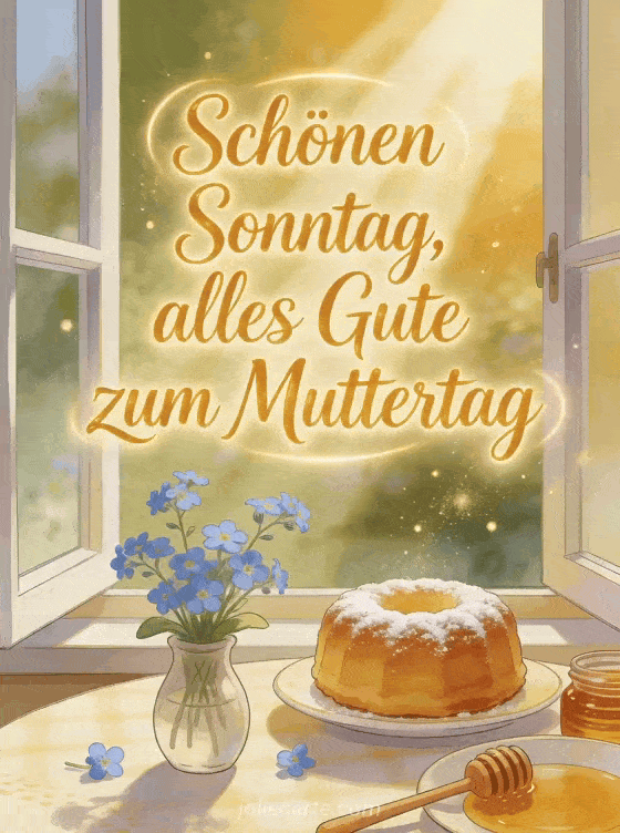 Teile eine helle Muttertagskarte für den Sonntagmorgen, mit honiggoldener Schrift, offenem Fenster, Vergissmeinnicht, Honigkuchen und goldenem Licht. Entdecke auch freie Muttertagsbilder, Mama alles Gute zum Muttertag wünschen oder kostenlose virtuelle Muttertagskarten.