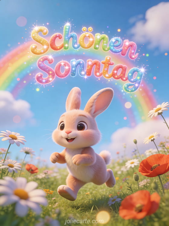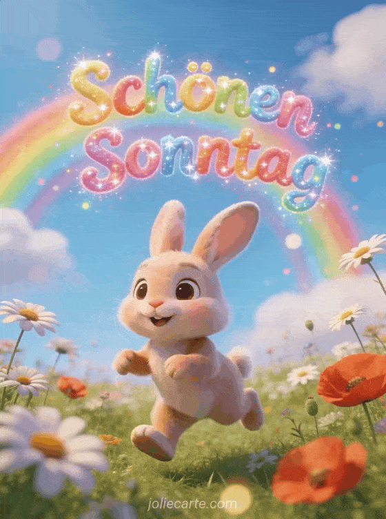Teile eine animierte Karte zum schönen Sonntag mit Regenbogenschrift, einem süßen Hasen, der durch Wildblumen, Margeriten und Mohnblumen unter einem blauen Himmel mit weichen Wolken hüpft. Entdecke auch animierte Marienkäfer schönen Sonntag GIFs oder lustiger schöner Sonntag Humor Tiere.
