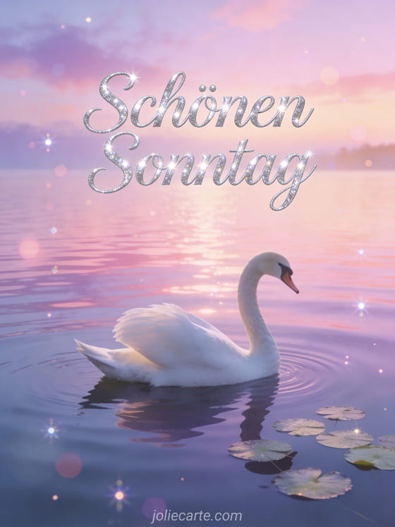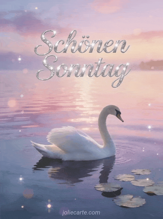 Teile animierte GIFs zum schönen Sonntag mit eleganter silberner Schrift, einem weißen Schwan, der bei Sonnenaufgang über einen ruhigen See gleitet, rosa und violetten Spiegelungen und Seerosenblättern. Entdecke auch Guten Morgen Sonntag Karte oder schönen sonnigen Sonntag GIF.