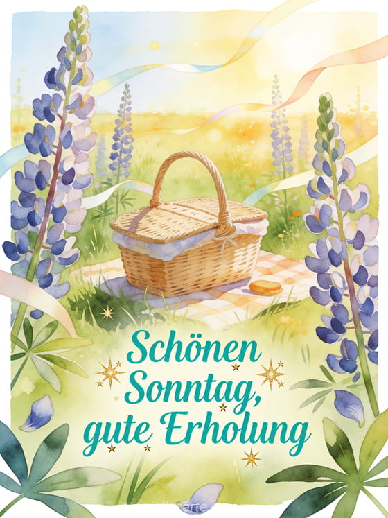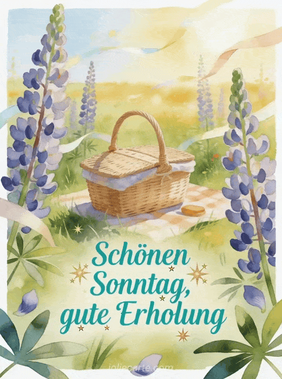 Teile einen erholsamen schönen Sonntag mit einem Picknickkorb auf einer sonnigen Wiese, hohen Lupinenblüten, Lichtbändern und einer fröhlichen Freizeitstimmung. Du kannst auch Schönen Sonntag Text, Schönen Sonntag Hunde Bild oder animierte virtuelle Schönen-Sonntag-Karte teilen.