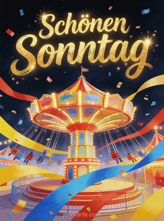 Sende schönen Sonntag mit einem Jahrmarktkarussell unter hellen Bändern und Konfetti, voller funkelnder Lichter und festlicher Farben. Entdecke auch animierte Schönen-Sonntag-Karte, Schönen Sonntag Humor animiertes GIF oder Guten Morgen schönen Sonntag Bild.