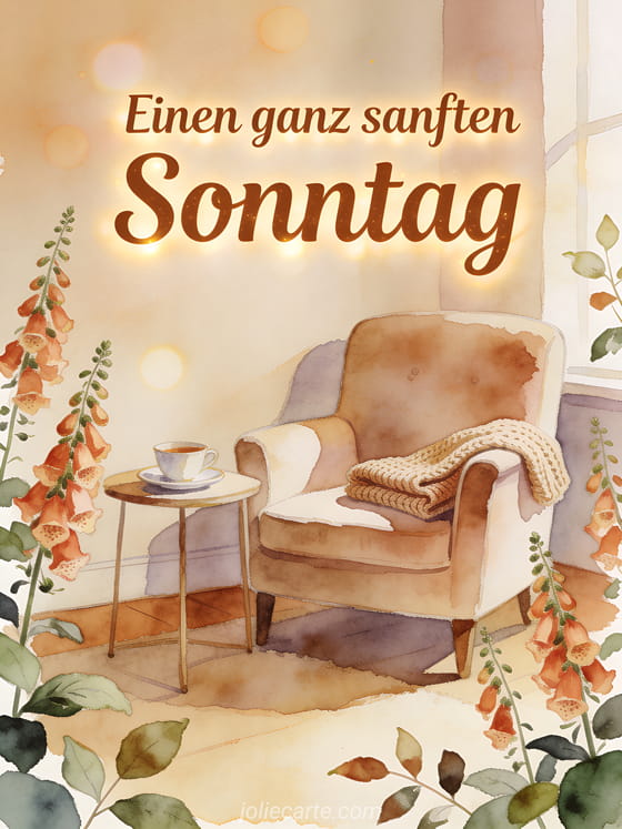 Sende Schönen Sonntag Cocooning Bild mit zimtfarbener Schrift, einem weichen Sessel, einem Beistelltisch mit Tee, einer gestrickten Decke und Fingerhutblüten. Entdecke auch sehr schöne Bilder schönen Sonntag, schönen Sonntag funkelndes animiertes GIF animiertes GIF oder ein schönes kostenloses Schönen-Sonntag-Bild.