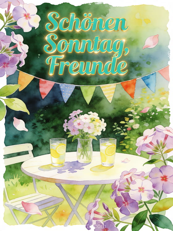 Sende Schönen Sonntag Freunde Bilder mit türkisfarbener Schrift, einem runden Gartentisch, Limonadengläsern, Phloxblüten und einer bunten Girlande. Entdecke auch ein Schönen Sonntag Blumenstrauß Bild, ein schönen Sonntag graues Bild oder Schönen sonnigen Sonntag GIFs.