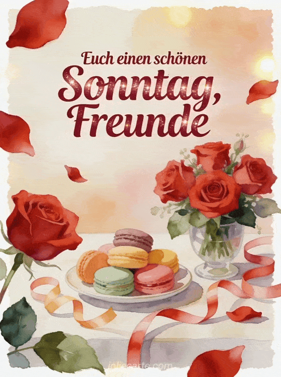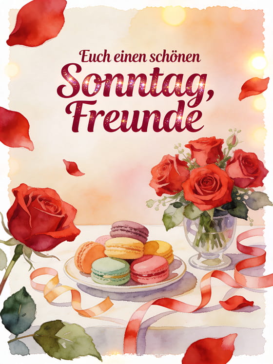 Feiere den Tag mit einem schönen Sonntag für Freunde in fröhlicher karmesinroter Schrift und schimmerndem Licht. Diese kostenlose Karte zeigt rote Rosen, bunte Macarons und Schleifen auf einem festlichen Tischgesteck. Entdecke auch eine schönen Sonntag Strand gif Karte, Schönen Sonntag euch allen Bilder oder schönen sonnigen Sonntag kostenlose Bilder.