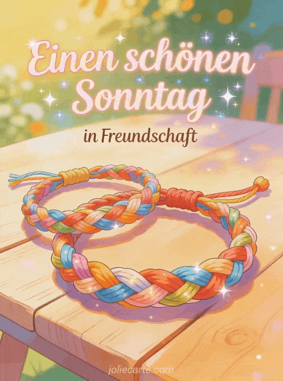 Verschicke einen herzlichen Gruß zum Sonntag in Freundschaft mit pastellfarbener Schrift, funkelnden Akzenten, geflochtenen Armbändern auf einem hellen Holztisch, bunten Fäden, sonnigen Tönen und freundlicher Stimmung. Dazu passen auch dieser Guten Morgen hallo schönen Sonntag, dieser schönen Sonntag Kaffee GIF oder dieser Schönen Sonntag Katze Humor.