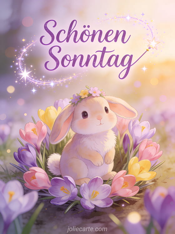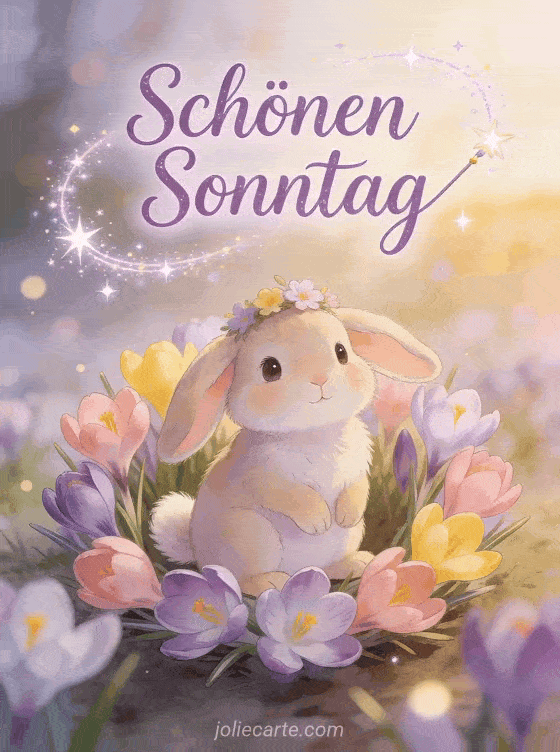 Erhelle jemandem den Sonntag mit dieser entzückenden Karte mit einem niedlichen Häschen umgeben von Frühlingskrokussen in einer magischen Erwachensszene. Entdecke auch eine Karte Schönen Sonntag Bilder, eine Karte guten Morgen schönen Sonntag Küsschen oder eine Karte schönen Sonntag lustiges GIF.