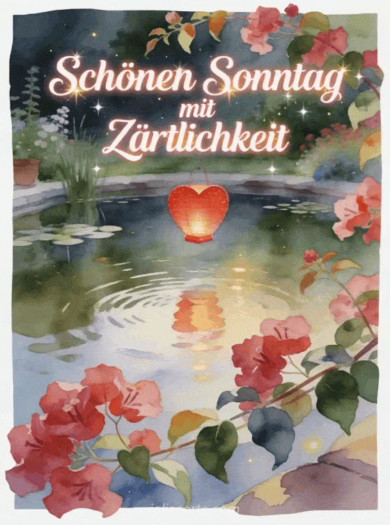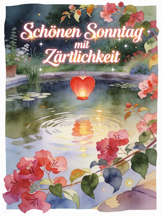 Teile Schönen Sonntag mit Zärtlichkeit mit himbeerfarbener Schrift, einer roten Herzlaterne über einem ruhigen Gartenteich und Bougainvillea-Blüten über dem Rand. Entdecke auch Guten Morgen Sonntag Bilder, sehr schönen Sonntag Bilder oder Schönen Sonntag Freunde Bilder.