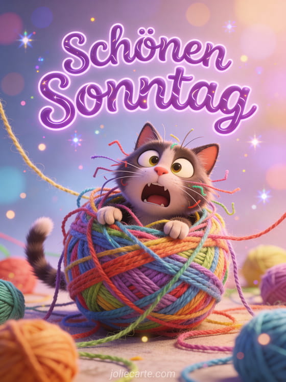 Teile ein animiertes GIF zum schönen Sonntag Humor mit flippiger violetter Schrift, einer verrückten roten Cartoon-Katze mit wilden Augen, die in einem chaotischen Wollknäuel steckt, und bunter Wolle überall. Entdecke auch Guten Morgen schönen Sonntag Bild oder Schönen Sonntag und schönen Tag.